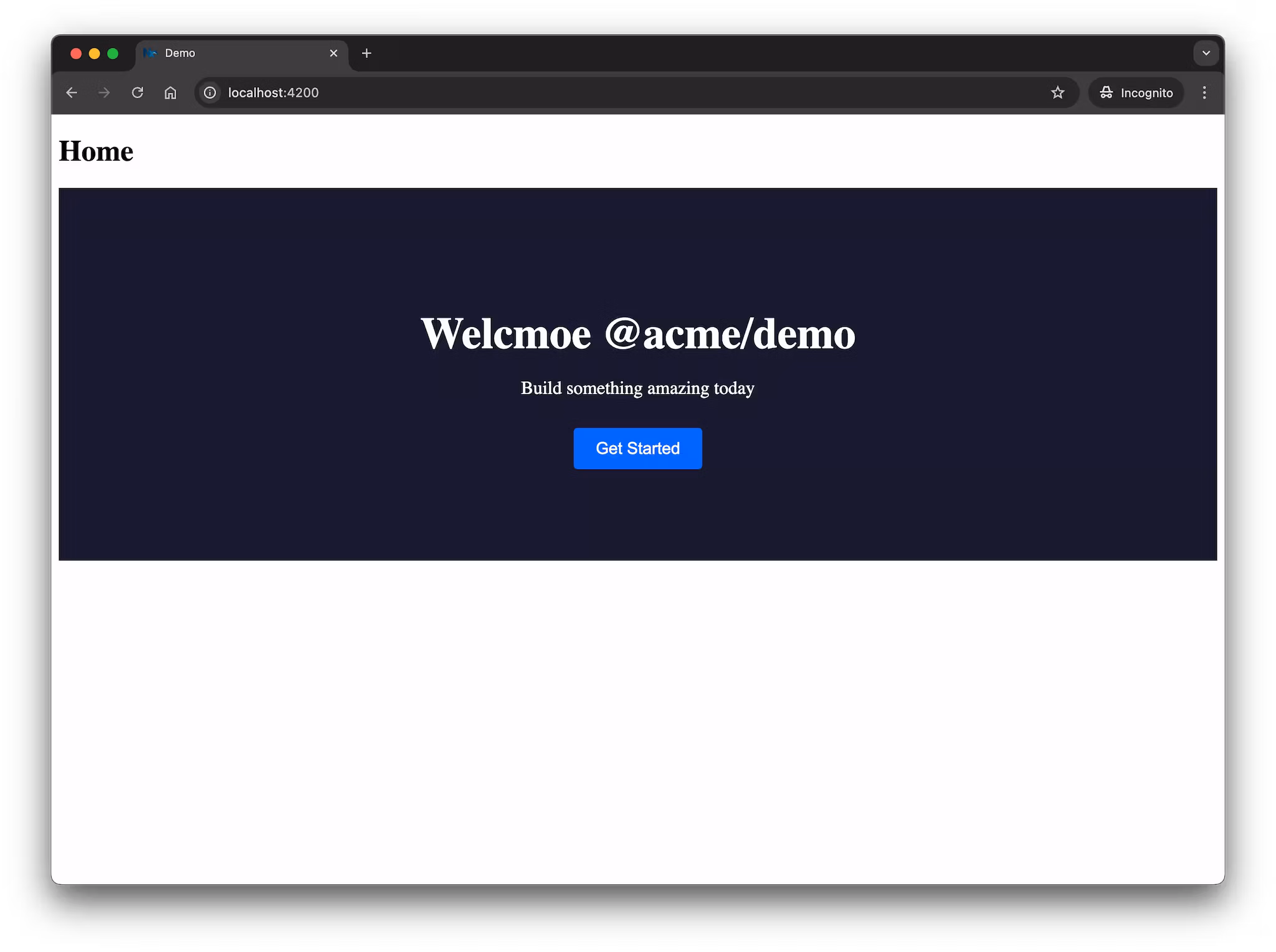 Serve your app again (npx nx serve demo) and you should see the new Hero component from the ui library rendered on the home page.